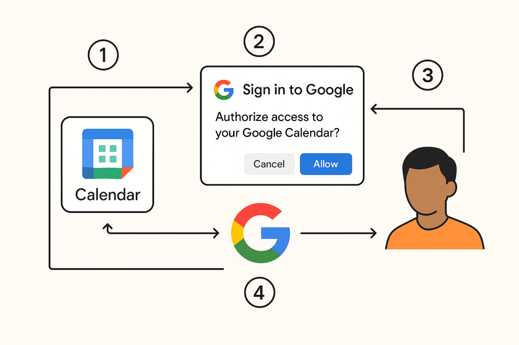 우리가 일정관리 웹 애플리케이션(Xscheduler)을 개발하는 팀이라고 가정해봅시다. 이 애플리케이션은 사용자가 입력한 일정을 자동으로 구글 캘린더에 추가하는 핵심 기능을 제공합니다. Xscheduler가 사용자의 구글 캘린더에 지속적으로 일정을 추가하려면 OAuth 인증을 통해 적절한 권한을 획득해야 합니다.